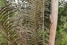 苏铁蕨是乌毛蕨科苏铁蕨属植物。根状茎粗壮,木质,直立圆柱状,直径达15厘米或更粗,高达1.5米或过之;鳞片红棕色或深棕色,有光泽,线状狭长披针形。叶簇生,叶柄禾秆色至深禾秆色,光滑或下部略粗糙,…全部>>