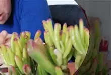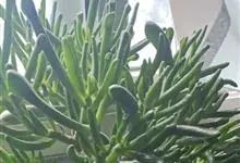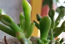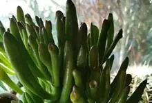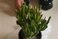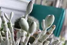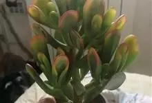 筒叶花月,是景天科青锁龙属的多年生草本植物。植株多分株,灌木状,茎较粗壮,圆柱形,表皮灰褐色;叶片肉质,互生,呈圆筒状,簇生于茎或分枝顶端,叶端呈斜截形,截面为椭圆形;花呈星状,淡白色;花期秋季。…全部>>