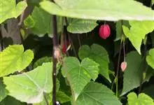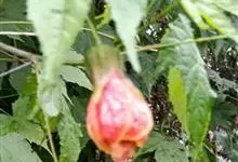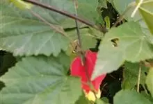 红萼苘麻是锦葵科、苘麻属常绿软木质灌木,叶绿色,长5-10厘米,心形,叶端尖,叶缘有钝锯齿,有时分裂,有细细的叶柄;叶互生,掌状叶脉;花单生于叶腋,具长梗,下垂;花萼红色,半套着大约4厘米长的花瓣,…全部>>