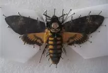 鬼脸天蛾,是鳞翅目天蛾科面形天蛾属动物。成虫翅展100~125毫米,体黑褐色;胸背有骷髅形斑纹;卵圆球形,直径约2毫米,淡黄绿色,表面光滑;老熟幼虫体长70~90毫米,蛹体长约56毫米;前翅为褐色,…全部>>