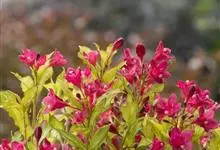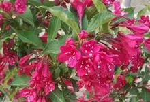 红王子锦带花是忍冬科锦带花属的落叶开张性灌木。株高1 -2米;嫩枝淡红色,老枝灰褐色;单叶对生,呈椭圆形,先端渐尖,叶缘有锯齿,红枝及叶脉具柔毛;花冠漏斗状钟形,花冠筒中部以下变细,聚伞花序,…全部>>