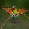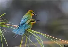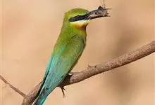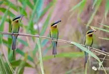 栗喉蜂虎是蜂虎科蜂虎属的鸟类。有热带鸟类羽毛艳丽的特征:喉部是栗红色的,黑色的过眼纹,翅膀和背部是绿色的,尾翼是蓝色的,飞行时翅膀下面的羽毛是橙黄色的,在阳光的照射下,它们全身闪烁着金属般的艳丽光泽,…全部>>