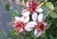 菲油果是桃金娘科、野凤榴属植物。常绿小乔木,高约5米;枝圆柱形,灰褐色。叶片革质,椭圆形或倒卵状椭圆形,长6-8.5厘米,宽3.4-3.7厘米。花直径2.5-5厘米;花瓣外面有灰白色绒毛,…全部>>