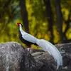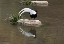 白鹇,是鸡形目雉科鹇属的一种留鸟。雄鸟上体白色并具黑色纹,下体黑色,头顶具黑色长羽冠,尾白而长;雌鸟体型较小,以橄榄褐色为主,下体具白色或皮黄色细纹;虹膜褐色,眼周具红色裸皮,喙黄色,脚鲜红色。…全部>>
