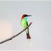 绿喉蜂虎是佛法僧目、蜂虎科的小型鸟类,共有9个亚种。身长22-25厘米,翼展29-30厘米,体重15-20克。喉绿色,额部、头顶至上背为锈红色,其余上体均为亮绿色。中央尾羽延长且端段狭细,…全部>>