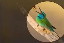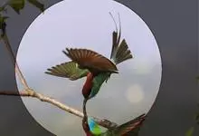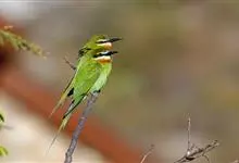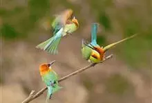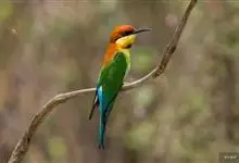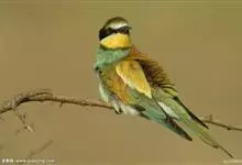 栗喉蜂虎是蜂虎科蜂虎属的鸟类。有热带鸟类羽毛艳丽的特征:喉部是栗红色的,黑色的过眼纹,翅膀和背部是绿色的,尾翼是蓝色的,飞行时翅膀下面的羽毛是橙黄色的,在阳光的照射下,它们全身闪烁着金属般的艳丽光泽,…全部>>
