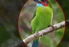 蓝喉蜂是蜂虎科蜂虎属鸟类。体长26-28厘米,嘴长而弯曲,有明显细长的中央尾羽。头部、颈部和背部为巧克力色,有黑色眼纹。喉部、腰部和尾羽为蓝色。腹部和两翼为绿色。幼鸟外观似成鸟,头部、颈部和背部为绿色,…全部>>