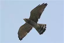 褐耳鹰的体形比苍鹰要小得多,为小型猛禽,体长为31-44厘米,体重217-325克。上体灰色,下体具赤褐色横斑。第6枚初级飞羽外羽片无缺刻,次外侧的4对尾羽具5道黑褐色横斑。眼先具白色短羽。…全部>>
