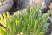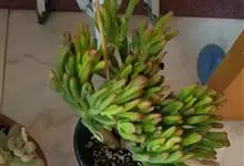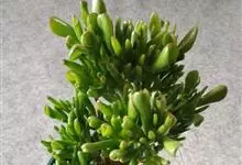 筒叶花月,是景天科青锁龙属的多年生草本植物。植株多分株,灌木状,茎较粗壮,圆柱形,表皮灰褐色;叶片肉质,互生,呈圆筒状,簇生于茎或分枝顶端,叶端呈斜截形,截面为椭圆形;花呈星状,淡白色;花期秋季。…全部>>