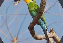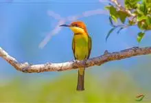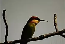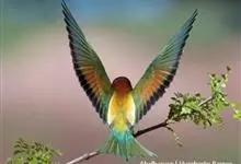 栗喉蜂虎是蜂虎科蜂虎属的鸟类。有热带鸟类羽毛艳丽的特征:喉部是栗红色的,黑色的过眼纹,翅膀和背部是绿色的,尾翼是蓝色的,飞行时翅膀下面的羽毛是橙黄色的,在阳光的照射下,它们全身闪烁着金属般的艳丽光泽,…全部>>