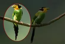 蓝喉蜂虎中型鸟类,体长26~28厘米。头顶至上背栗红色或巧克力色,过眼线黑色,腰和尾蓝色,翼蓝绿色,腰及长尾浅蓝,中央尾羽延长成针状,明显突出于外。颏喉蓝色,其余下体和两翅绿色。嘴细长而尖,黑色,…全部>>