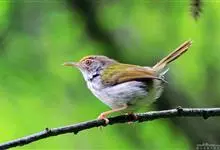 普通缝叶莺,是雀形目鹅科莺亚科缝叶莺属一种。体长10-14厘米,体重7-10克,雄鸟前额棕红,头顶至枕棕橄榄褐,上体橄榄绿染黄,飞羽及尾羽暗褐;繁殖期雄鸟的中央尾羽特形延长,下体淡皮黄白色。…全部>>