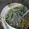 京之华锦是独尾草科瓦苇属的一种植物。也叫凝脂菊,为京之华的斑锦变异品种,植株群生,扁棒状三角形肉质叶排成莲座状,叶表平展,背部隆起,全叶有黄色或白色纵向缟纹,少数叶整片都呈黄色或白色。株型小巧,…全部>>