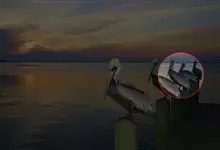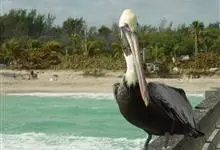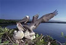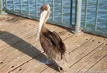 褐鹈鹕:是鹈鹕家族中体型最小的成员。体型粗大,体重6.5-9千克。嘴形宽大直长,上嘴尖端朝下弯曲,呈钩状;下嘴分左右二支,其间有一巨大而能扩缩的皮肤喉囊;鼻孔小,而位于嘴基。眼前部裸出。颈长而较细小…全部>>
