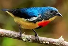 红胸啄花鸟:体重5-10克,体长60-92毫米。体形纤小。雄鸟上体呈辉亮的金属绿色;下体棕黄,胸部具一朱红色块斑,极易与其他啄花鸟区别。雌鸟上体呈橄榄绿,下体棕黄色。虹膜褐色,嘴褐黑色或角灰色,…全部>>
