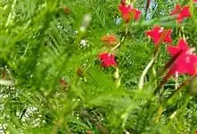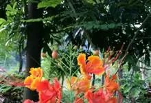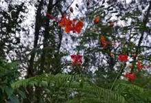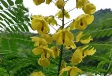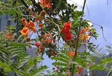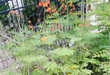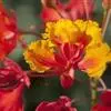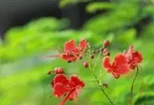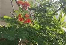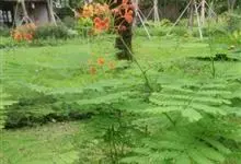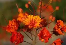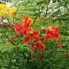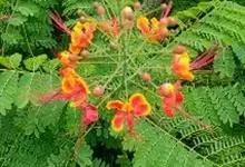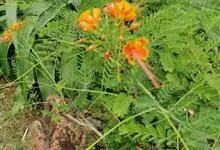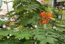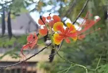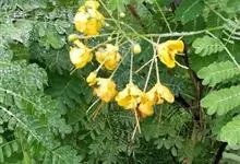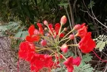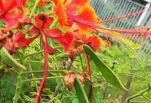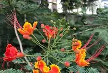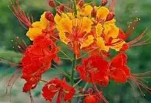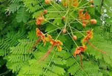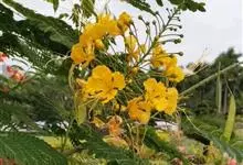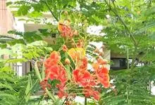 洋金凤 Sw.),豆科小凤花属灌木状或小乔木植物,枝无毛,绿或粉绿色;二回羽状复叶;总状花序伞房状,萼片无毛,花瓣橙红或黄色,圆形,花丝红色,子房无毛,花柱橙黄色;荚果窄而薄,…全部>>