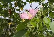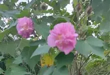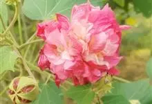 木芙蓉,锦葵科木槿属落叶灌木或小乔木。小枝上有细绒毛;叶片为卵状心形,托叶为披针形,常早落;花单生,花萼为钟形,花冠初为白色或淡红色,后逐渐变为深红色;果实为扁球形,有淡黄色的毛附着。花期8到10月。…全部>>