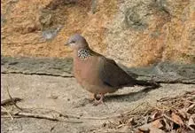 棕斑鸠,是鸽形目鸠鸽科斑鸠属鸟类。整个头和颈淡粉红色,头顶和前额较暗,颊、喉较淡,前颈基部两侧羽毛黑色具宽阔的棕色端斑,使前颈两侧形成黑色斑点状的黑斑。…全部>>