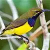 绿喉太阳鸟:共有9个亚种。小型鸟类,雄鸟体长13-15厘米、雌鸟10-12厘米。雄鸟前额至后颈、颏和喉辉绿色,头侧黑色,颈侧和背暗红色,两肩、下背橄榄绿色,腰鲜黄色,尾上覆羽和中央尾羽暗绿色,…全部>>