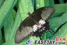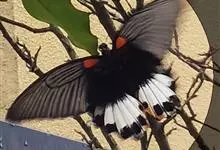 玉斑凤蝶Papilio helenus 别名白纹凤蝶,是凤蝶科凤蝶属美凤蝶亚属大型种类。雌雄同型;体翅皆黑色,后翅正面中室外有3个并列的白色斑,亚外缘有1列模糊的新月形红色斑,…全部>>