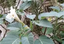 曼陀罗,茄科曼陀罗属一年生大型草本植物,全株光滑。有臭气;叶呈广卯形,边缘具不规则波状浅齿裂;花单生于枝杖间或叶腋,直立,有短梗;花萼是筒状裂片三角形,颜色为白色或淡紫色;果实为蒴果卵状,…全部>>