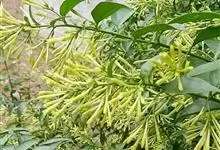 夜香树是茄科、夜香树属直立或近攀援状灌木。枝条细长而下垂。叶有短柄,叶片矩圆状卵形或矩圆状披针形,全缘,顶端渐尖,基部近圆形或宽楔形,两面秃净而发亮,有6-7对侧脉。伞房式聚伞花序,腋生或顶生,…全部>>