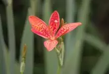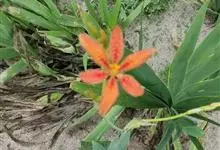 射干 Redouté)是鸢尾科射干属多年生草本植物。根状茎为不规则的块状,斜黄色或黄褐色;花橙红色,散生紫褐色的斑点;花药呈条形;子房下位,倒卵形;蒴果倒卵形或长椭圆形;种子圆球形,黑紫色,有光泽。…全部>>