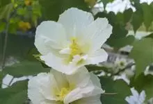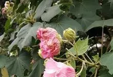木芙蓉,锦葵科木槿属落叶灌木或小乔木。小枝上有细绒毛;叶片为卵状心形,托叶为披针形,常早落;花单生,花萼为钟形,花冠初为白色或淡红色,后逐渐变为深红色;果实为扁球形,有淡黄色的毛附着。花期8到10月。…全部>>