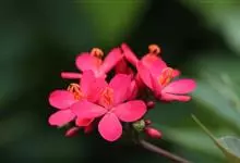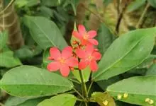 变叶珊瑚花,是大戟科麻风树属常绿灌木。变叶珊瑚花单叶互生,倒阔披针形,叶面为浓绿色,叶背为紫绿色,叶柄具茸毛,叶面平滑,常丛生于枝条顶端;花单性,雌雄同株,花冠红色或粉红色,雌、雄花不同时开放;具乳汁,…全部>>