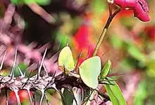 虎刺梅:别称铁海棠,是蔓生灌木植物。茎多分枝,长60-100厘米,直径5-10毫米,具纵棱,密生硬而尖的锥状刺,刺长1-1.5厘米,直径0.5-1.0 毫米,常呈3-5列排列于棱脊上,呈旋转。叶互生…全部>>