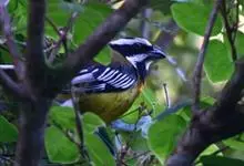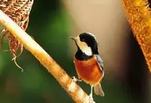 杂色山雀,是山雀科山雀属的一种动物。体重17-18克,体长125-140毫米。雌雄羽色相似。额、眼先、耳羽至颈侧乳黄色,头顶至后颈黑色,后头中央有一白斑。上背栗色,上体余部及翼蓝灰色。颏、喉黑色,…全部>>