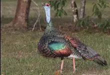 眼斑吐绶鸡:是火鸡科的两种鸟类之一。体型比普通火鸡略小些,体长1米左右,体重2.4-5.4千克,雄性比雌性略大,长得很特别,蓝色的秃脑袋上冒出几个橙黄色的疙瘩。但是它羽色艳丽,身体呈铜色及绿色。…全部>>