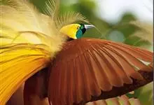 大极乐鸟是极乐鸟属中最大的鸟种。成年雄鸟体长可达到43厘米,雌性可达35厘米。雄鸟的额、颊、喉等墨绿色;头、颈黄色;上体暗赤栗色;腹部葡萄红色,胁部有长饰羽,其基部橙黄,中部黄色,…全部>>