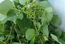 千金藤 Miers),防己科千金藤属多年生草质或近木质缠绕藤本植物。根圆柱状;皮暗褐色;小枝细弱而韧,老茎木质化圆柱形;叶阔卵形草质或纸质;花序伞状腋生,花小黄绿色;核果球形红色;花期5-6月,…全部>>
