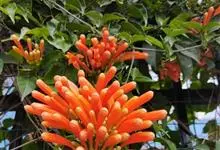 炮仗藤 Miers)紫葳科炮仗藤属藤本植物。小枝顶端有丝状卷须;叶对生,卵形;花萼钟状,橙红色,长椭圆形,花丝丝状,花药叉开;果瓣为革质,舟状。花期1-6月。初夏红橙色的花朵累累成串,状如鞭炮,…全部>>
