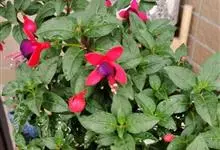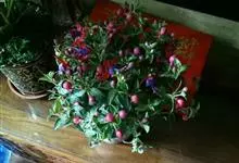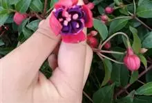 倒挂金钟是柳叶菜科倒挂金钟属亚灌木植物。茎直立,多分枝;幼枝带红色,被短柔毛与腺毛,老时渐无毛;叶对生,卵形或窄卵形,脉常带红色;常带红色,被短柔毛与腺毛;花筒红色,筒状钟形,…全部>>
