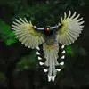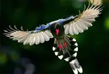 台湾蓝鹊:体长64至65厘米,翼展18至21厘米,尾长约40厘米,尾羽长占了总体长的三分之二。头、脸、颈、喉、胸都是黑色,黄色的眼珠包围黑色的瞳孔,鲜红色的鸟喙、双脚,…全部>>