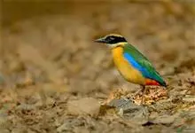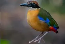蓝翅八色鸫是雀形目八色鸫科的鸟类。体长17-20厘米,体重类约48-70克,体型圆胖,尾短,腿长,以身体具有红、绿、蓝、白、黑、黄、褐、栗等鲜艳夺目,丰富艳丽的色彩而得名,是很有观赏价值的鸟类。主要…全部>>