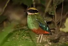 绿胸八色鸫:是雀形目八色鸫科的鸟类,共有12个亚种。体长为16-18厘米,体重65-69克。体型圆胖,尾短,腿长。头黑,上体绿色,两翼深色而具白色斑纹,头顶至后枕深褐,胸及腹部苹果绿,臀亮红。…全部>>