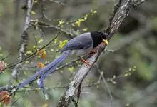 黄嘴蓝鹊是鸦科、蓝鹊属的鸟类。大型鸦类,体长45-69厘米。尾特长,呈凸状,蓝色,具黑色亚端斑和白色端斑。整个头、颈和上胸黑色,枕部有一白斑,其余上体紫蓝灰色。胸和上腹灰而沾紫蓝色,…全部>>