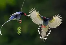 台湾蓝鹊:体长64至65厘米,翼展18至21厘米,尾长约40厘米,尾羽长占了总体长的三分之二。头、脸、颈、喉、胸都是黑色,黄色的眼珠包围黑色的瞳孔,鲜红色的鸟喙、双脚,…全部>>