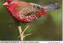红梅花雀小型鸟类,体长9-10厘米。雄鸟通体朱红色,背、肩、胸等满布白色小斑点,两翅和尾黑褐色均具白色端斑,嘴红色,脚蜡黄色。雌鸟上体淡褐色或赭褐色,翅上中覆羽、大覆羽和内侧飞羽末端具白色斑点,…全部>>