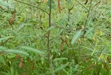 合萌,别名田皂角、水松柏、水槐子、水通草,中药名:梗通草。豆科一年生草本或亚灌木状植物,茎直立,叶对生,总状花序,腋生,花萼膜质,花冠淡黄色,子房扁平,线形。种子黑棕色,肾形,花果期7~10月。…全部>>