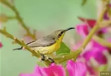 黄腹花蜜鸟是雀形目太阳鸟科花蜜鸟属鸟类。体型较小、喙略短而弯、腹部黄色。雄鸟繁殖季节颏及胸黑紫色并泛金属光泽,具有绯红色及灰色胸带,将上腹部黑色斑与前胸隔开,肩斑为橙黄色丝质羽,上体橄榄绿色,…全部>>