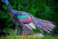 眼斑吐绶鸡:是火鸡科的两种鸟类之一。体型比普通火鸡略小些,体长1米左右,体重2.4-5.4千克,雄性比雌性略大,长得很特别,蓝色的秃脑袋上冒出几个橙黄色的疙瘩。但是它羽色艳丽,身体呈铜色及绿色。…全部>>