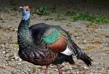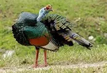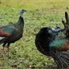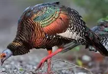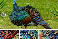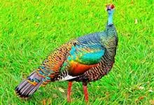 眼斑吐绶鸡:是火鸡科的两种鸟类之一。体型比普通火鸡略小些,体长1米左右,体重2.4-5.4千克,雄性比雌性略大,长得很特别,蓝色的秃脑袋上冒出几个橙黄色的疙瘩。但是它羽色艳丽,身体呈铜色及绿色。…全部>>