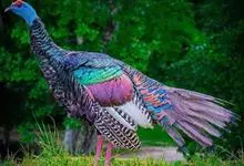 眼斑吐绶鸡:是火鸡科的两种鸟类之一。体型比普通火鸡略小些,体长1米左右,体重2.4-5.4千克,雄性比雌性略大,长得很特别,蓝色的秃脑袋上冒出几个橙黄色的疙瘩。但是它羽色艳丽,身体呈铜色及绿色。…全部>>