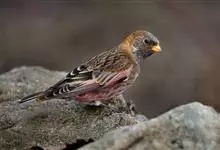 粉红腹岭雀:为燕雀科岭雀属的鸟类。体重25-34克,体长150-182毫米。是一种中等体型的深色岭雀。两翼及下体玫红色。东北亚种的雄鸟额、顶冠及脸灰;上背黄褐;上体深褐,…全部>>