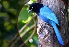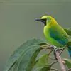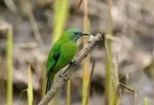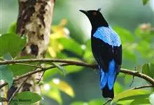 蓝翅叶鹎:小型鸟类,体长15-18厘米。雄鸟通体草绿色,尾蓝绿色,肩和翅亮蓝 色,胸缀有黄色,颏、喉黑色。雌鸟颏,喉蓝绿色。栖息在海拔1500米以下的常绿阔叶林、次生林和林缘疏林灌丛中。…全部>>