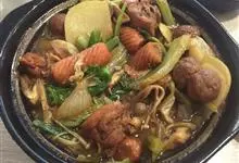 猪肚包鸡,是一道广东省传统的地方名菜,属于客家菜系,又名猪肚煲鸡、凤凰投胎,流行于广东的深圳、惠州、河源、梅州等粤东一带,是广东客家地区酒席必备的餐前用汤,汤里浓中带清,有浓郁的药材味和胡椒香气。…全部>>